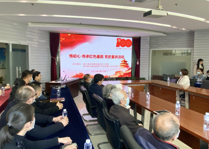 牢记初心使命,传承红色基因,学习百年党史,凝聚奋进力量。为深入学习贯彻习近平总书记在党史学习教育动员大会上的重要讲话精神,认真贯彻党中央、省、市委以及集团公司的相关工作部署和要求,在公司党员中迅速掀起党史学习教育的热潮,3月25日下午,城投房地产公司联合名都花园社区大党委举办以“悟初心 传承红色基因”为主题的党史宣讲活动,湖北省委直属机关工委党校讲师邓洪洁在会上作“毛泽东同志在武汉”专题党课报告。