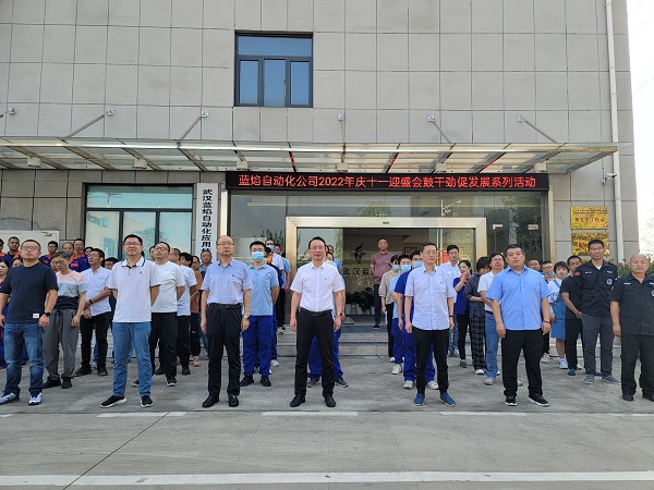 为庆祝新中国成立七十三周年、喜迎党的二十大胜利召开,9月29日,武汉蓝焰自动化公司在园区内开展了“庆十一、迎盛会、鼓干劲、促发展”的系列主题活动,共同表达对国家和党的忠诚与热爱,同时,进一步激励广大公司职工发扬团结拼搏、奋发进取、爱岗敬业的时代精神风范。庆祝活动在升旗仪式中拉开序幕,董事长安文风带领全体自动化园区人员参加此次升旗仪式。仪式上,身着蓝焰工服的升旗手们精神抖擞,随着出旗曲响起,他们迈着铿锵有力的步伐走向升旗台,在国歌奏响的刹那,旗手迅速有力地将五星红旗甩向空中,展开的五星红旗在雄壮的国歌声中冉冉升起,全体职工整齐站立,面向国旗行注目礼,共同表达对伟大祖国的深情厚爱和美好祝愿!