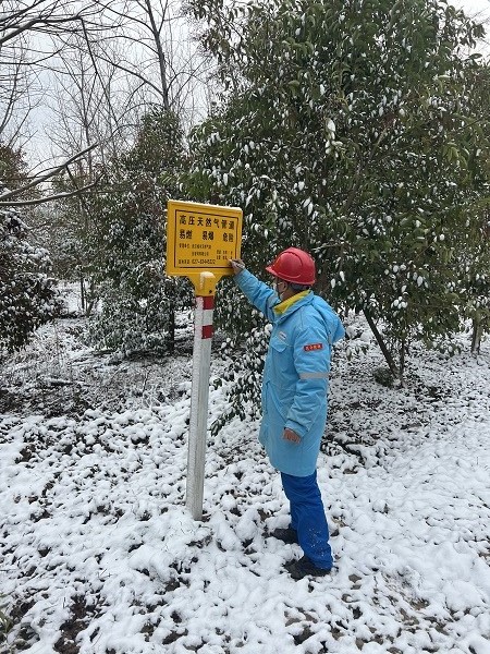 在冬季保供的关键节点,突如其来的大雪无疑给武汉高压管网公司安全生产运行工作带来了挑战。行走在白茫茫的田野,那一道蓝色的身影格外亮眼,红色安全帽上的宝石花格外让人安心。巡线稽查员韩政说:“我们的天然气管道埋在地下,穿过田野、河流、村庄甚至山坡,不要以为巡线就是沿着三桩一牌走走看看,我们要认真记录这些桩和牌的点位,发现缺失和损坏的及时修补,还要排查管道上方是否有第三方施工、违章占压等现象发生……同时检测管道的阴极保护电位是否正常。巡线员的主要工作就是用脚步丈量每一寸管线,掌握实际运行情况,及时发现安全隐患,确保燃气管道的安全,丝毫不能马虎。”