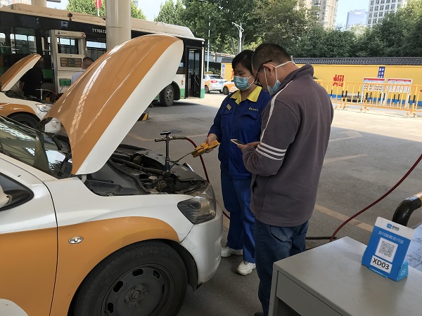 蓝焰油气公司CNG加气站工作人员检查供气设备,为车辆加气和安检