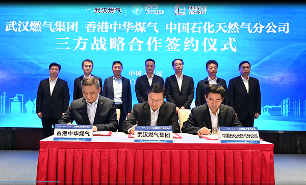 4月1日下午,武汉市燃气热力集团有限公司(简称武燃集团)、香港中华煤气公司(简称中华煤气)、中国石化集团天然气分公司(简称中石化天然气分公司)在武汉举行三方战略合作签约仪式,标志着全市天然气供气“一张网”建设迈出关键一步。市发改委副主任王永胜,市城管委副主任周斌,市国资委副主任曹非市城投集团公司总经济师邢耀霖,市城投集团公司党委委员、副总经理兼武燃集团党委书记、董事长黄峰,中华煤气公用事业营运总裁、港华智慧能源营运总裁纪伟毅,中石化天然气分公司党委委员、副总经理左志民出席了签约仪式。